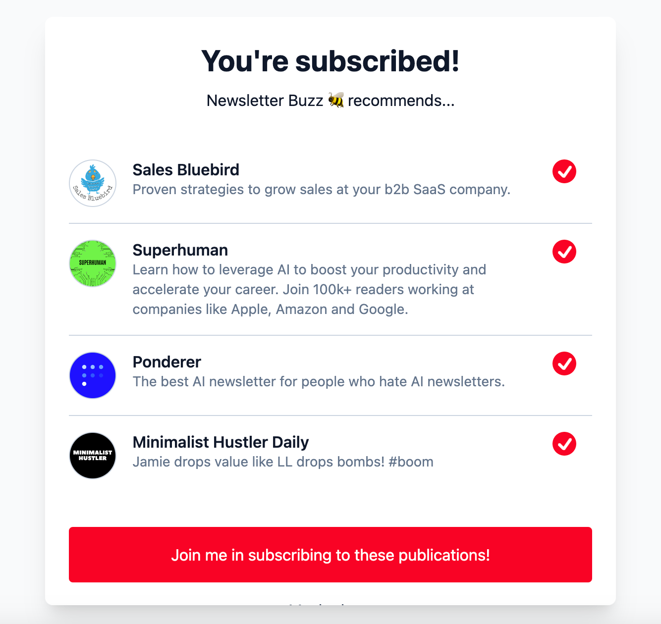 The catch? Your cross-promotion partners must be approved Upscribe users. If that's not you yet, sign up here. And hey, if you'd like to add "Newsletter Buzz" to your list, I'd be eternally grateful.